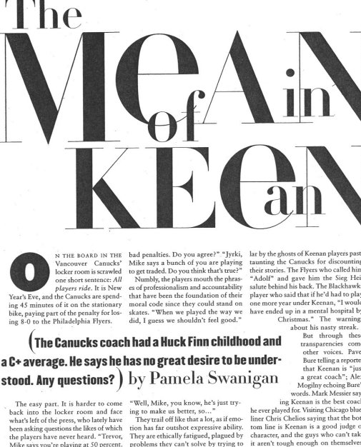 “With Keenan’s arrival, the conversation has turned contentious. A virtual Mason-Dixon line is drawn between those who thinks Keenan’s ends justify his means and those who think meanness cannot be justified by any end. The former call the latter sentimentalists. The latter accuse the former of heartlessness. Mike Keenan is exactly what’s wrong with pro sports, complain the sentimentalists. ‘Niceness’ is exactly what’s wrong with the Canucks, say the Keenanites.”